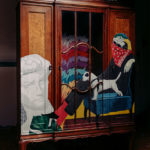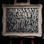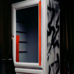 Handgefertigter Stuhl, den der Künstler als Junge aus der Schule entwendet hat. Stunden des Abschreibens und Nachsitzens stecken in diesem Stück. Aus der Sauklaue damals wurden kunstvolle Kalligraphieschriftzüge und Abstrakte Gestaltungen.